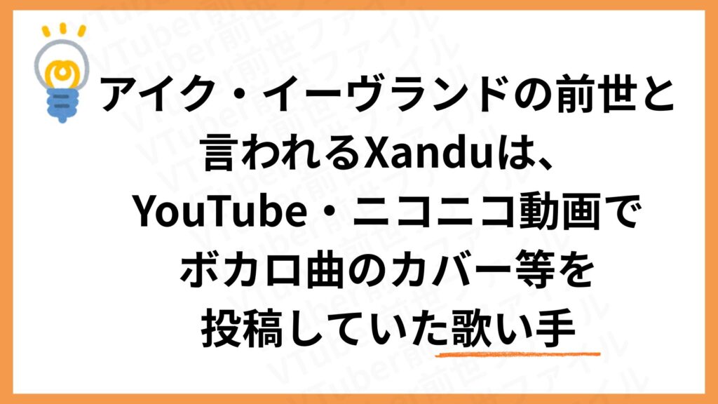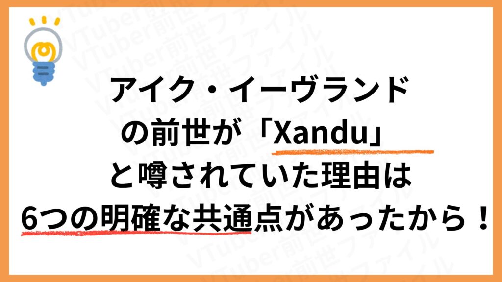とある炎上事件で、アイク・イーヴランドの前世が歌い手のXandu(ザンドゥ)であることは確定してしまいましたが、事件がある前でも、共通点の多さから、アイク・イーヴランドの前世はXanduなのではと噂になっていました。