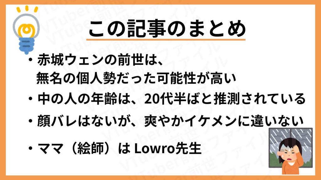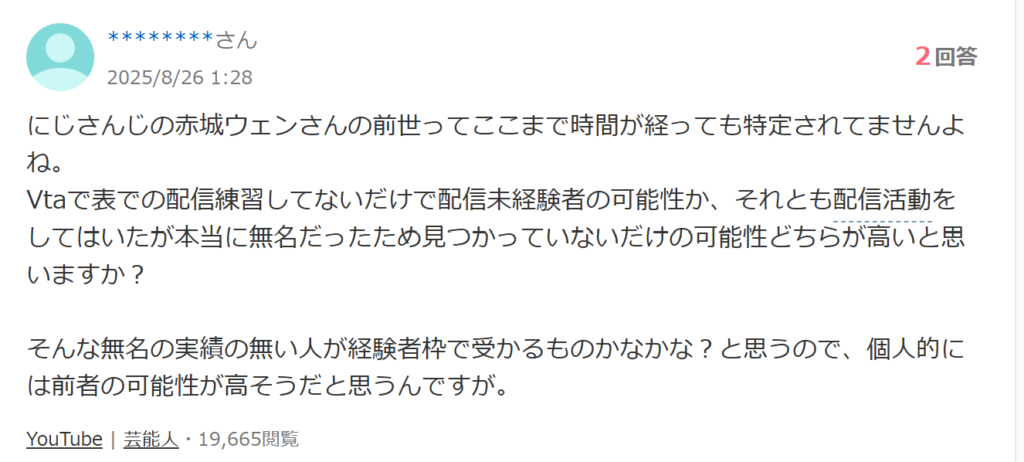 総合すると、赤城ウェンの前世は「存在していた可能性は高いが、無名・小規模な活動だったため特定されていない」という見方が、現時点でのもっとも妥当な見解と言えるでしょう。