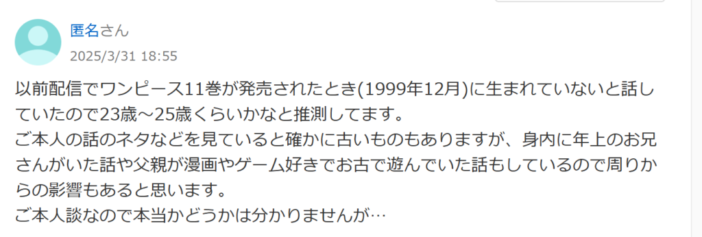 もちろん、公式に年齢が明かされているわけではなく、あくまで配信内容や発言をもとにした考察です。