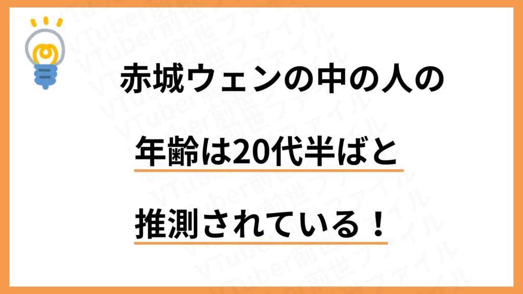 以上を総合すると、赤城ウェンの中の人の年齢は23〜27歳前後、特に24〜26歳あたりがもっとも現実的なラインと考えられているのが現状です