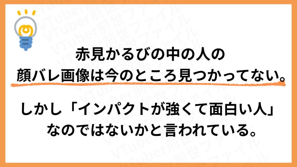 現時点で、赤見かるびの中の人の顔バレ画像はありません。