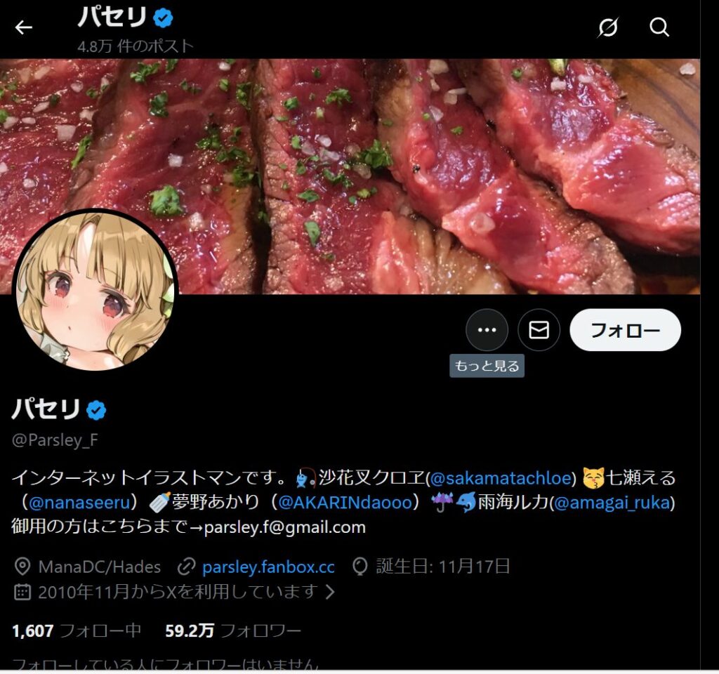 ママ(絵師)のパセリ先生のプロフィールに、沙花叉クロヱと雨海ルカの名前があります。