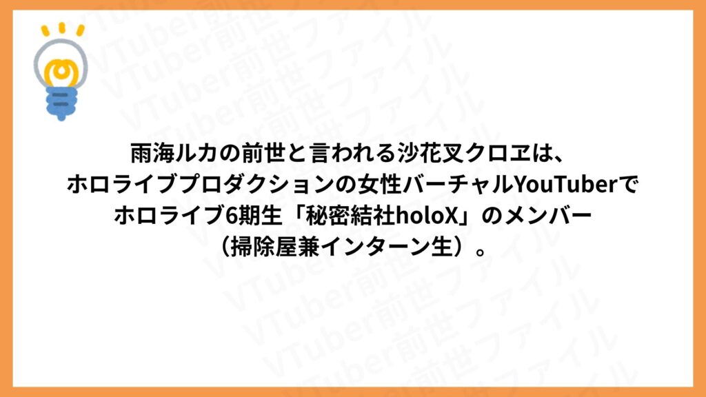 なんと、前世はホロライブプロダクションの女性バーチャルYouTuberグループで、ホロライブ6期生「秘密結社holoX」のメンバー(掃除屋兼インターン生)の沙花叉クロヱ(さかまたくろえ)では?と噂になっているようです。