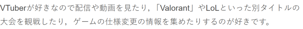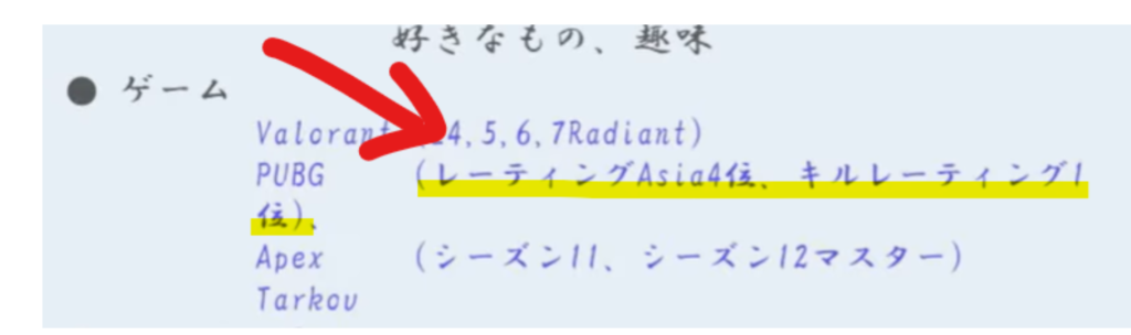ゲームがとても得意で、基本的にはVALORANT・PUBG・Apexをプレイしており、PUBGでは合計約10,000時間プレイしています。