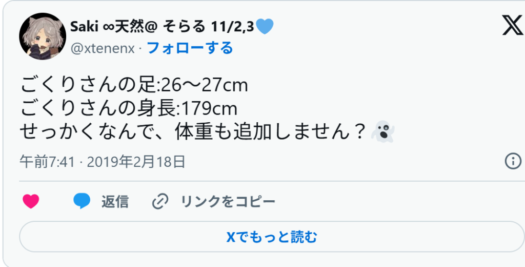Gokuriの身長もファンのツイートから「179cm」だということが判明しています。