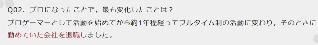 プロゲーマーとして1年程経過したタイミングでもともと勤めていた会社を退職しています。