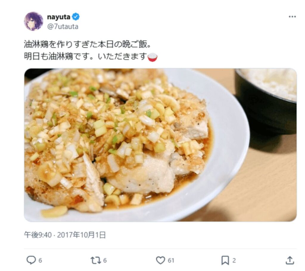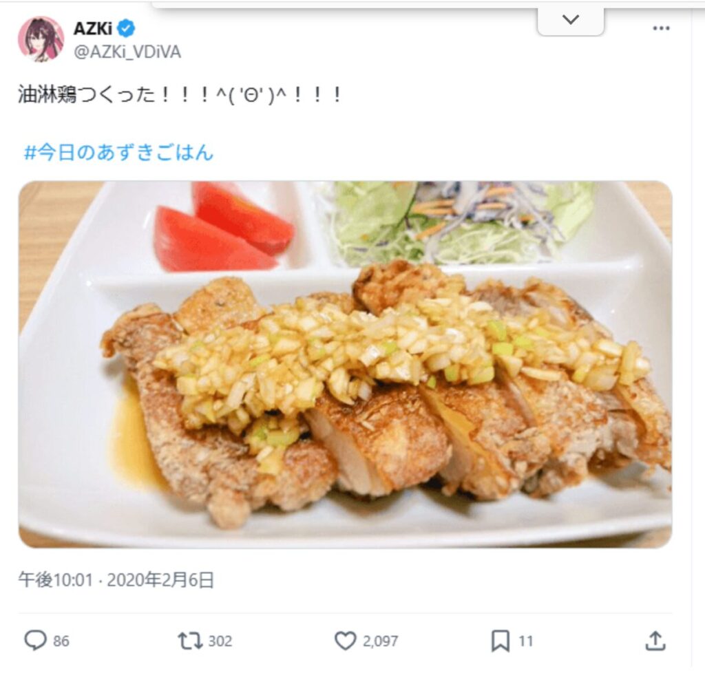 AZKiは自身のXで手作りの油淋鶏の写真を投稿しており、nayutaも同じくXで手作りの油淋鶏の写真を公開していました。