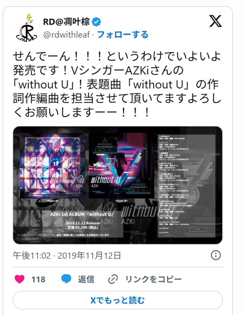 AZKiの代表楽曲『Without U』は、音楽サークルRD-Soundsが手がけています。