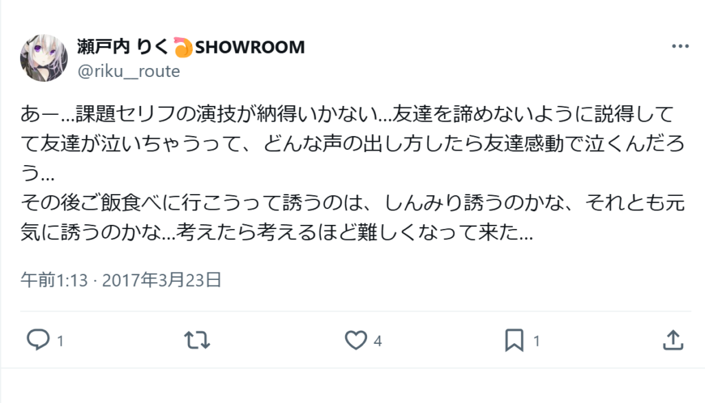 声優になるために表現力への努力や葛藤などもSNSでこぼしていたり、とても真摯に取り組んでいたことが分かります。