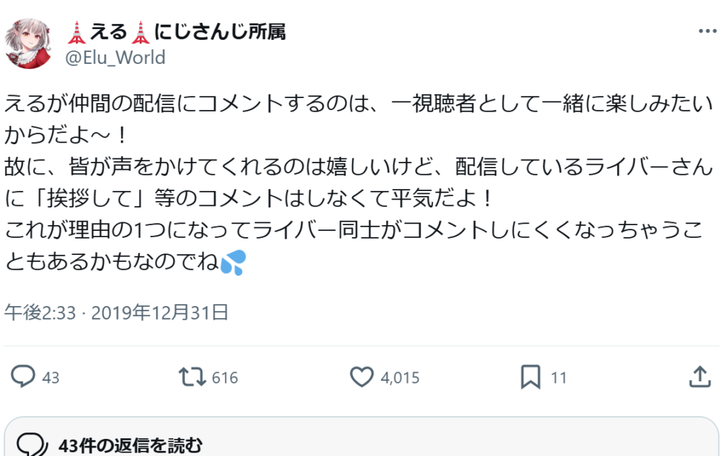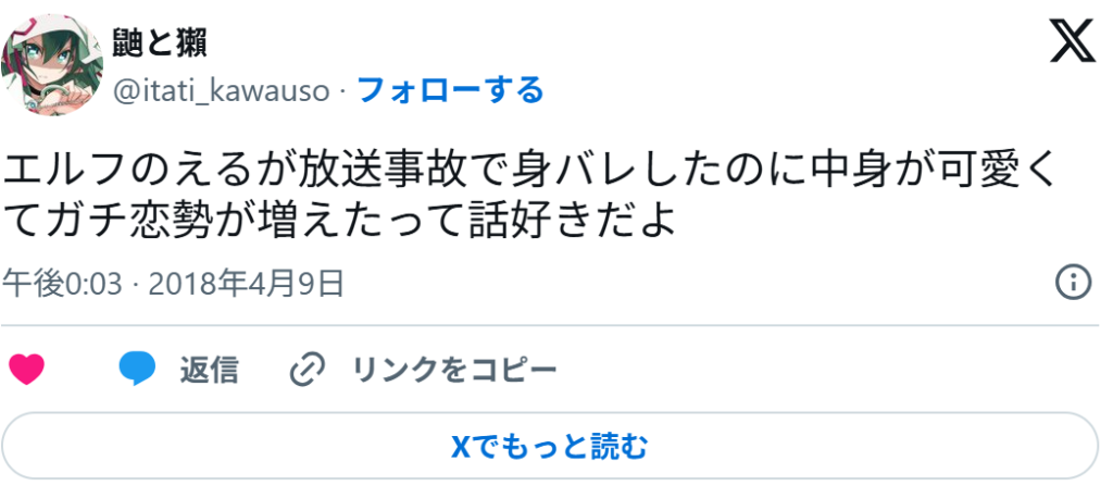 こうした4つの共通点から、ファンの間ではエルフの”える”の前世は瀬戸内りくだと、確信に近い声が上がっています。