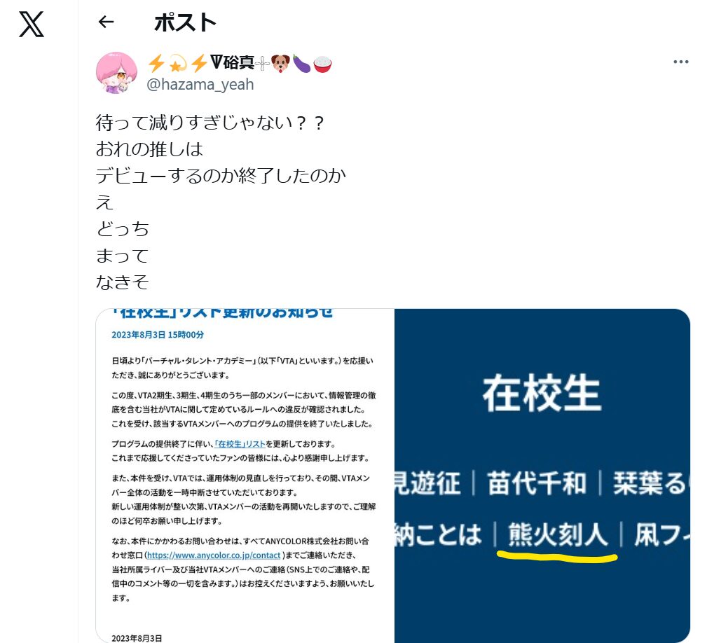 熊火刻人は、2023年7月に華々しく活動を始めたものの、にじさんじのVTA(バーチャル・タレント・アカデミー)はわずか1か月後の8月に突然の活動休止。
