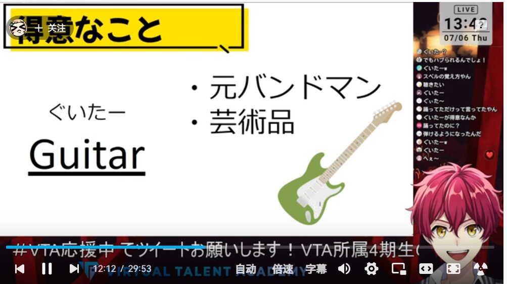 初配信では特技がエレキギターで、リードギターを担当していることも明かしていました。