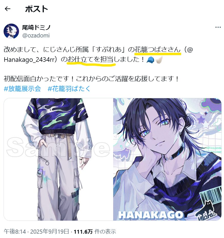 ちなみに、花籠つばさのキャラクターデザインについて尾崎ドミノ先生の名前を見かけることがありますが、尾崎ドミノ先生はお仕立て担当であり、“ママ”と呼ばれるキャラクター原案者とは異なります。