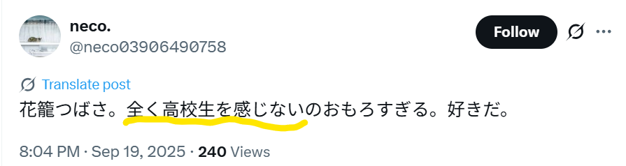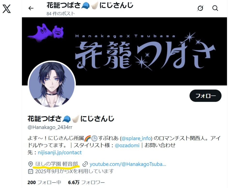 花籠つばさはXのプロフィール欄に“ほしの学園の軽音部”と書いています。