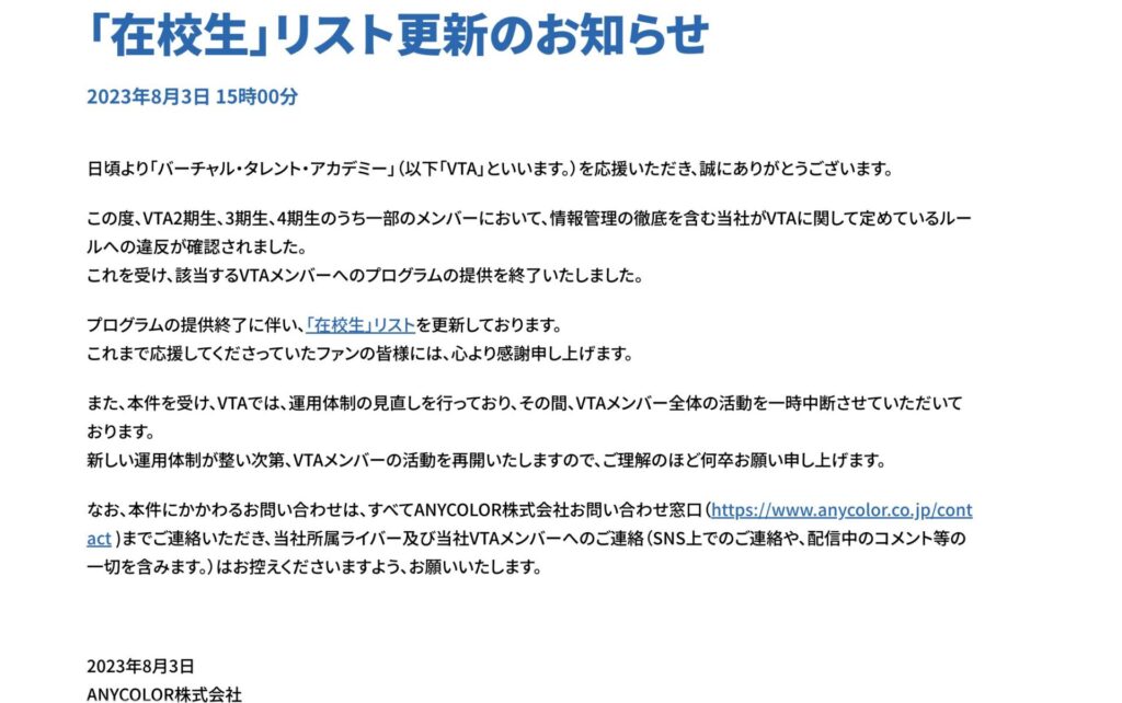 理由はVTAの2〜4期生の一部で、情報管理などのルール違反が見つかったためとのことでした。