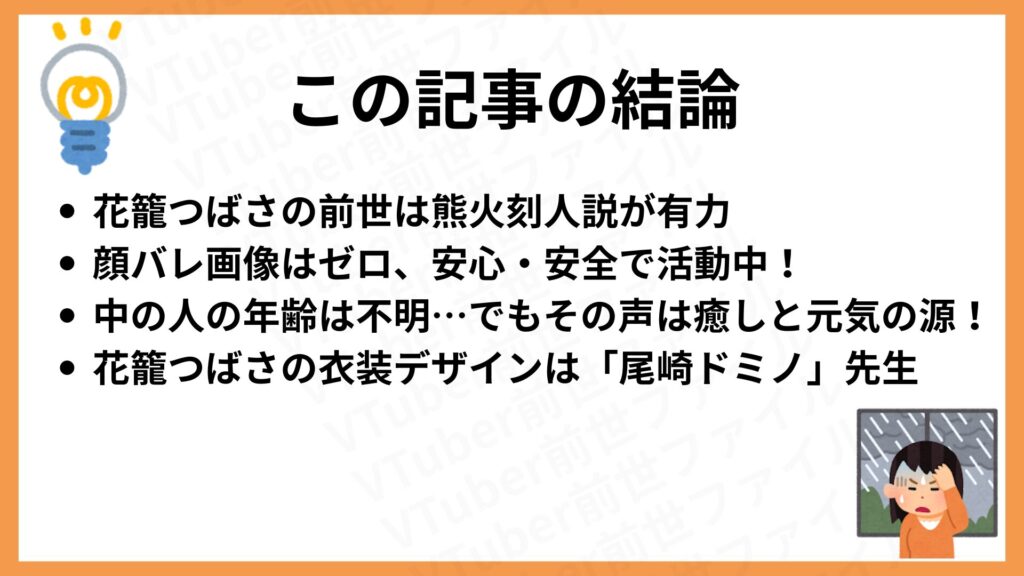 前世と噂される熊火刻人もVTA出身で顔出しして活動していたわけではないため、花籠つばさ自身も同様に顔バレしていないと考えられます。