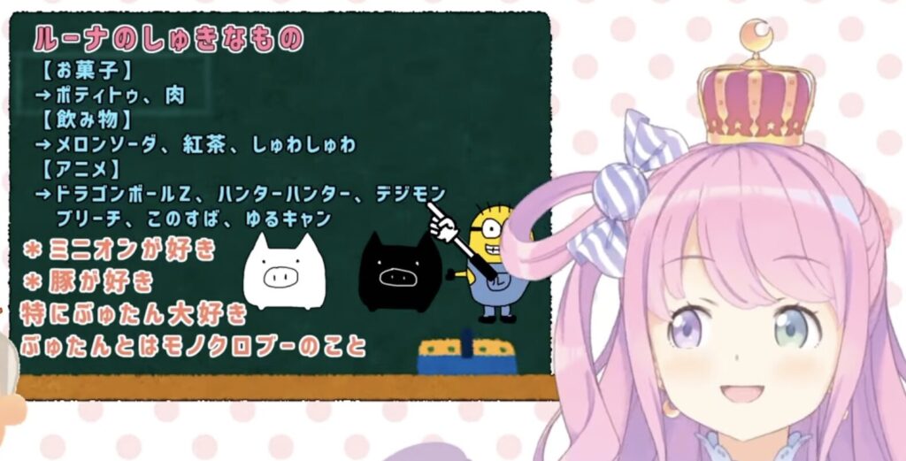 初配信の時、姫森ルーナは「ミニオン」と「ぶゅたん(モノクロブー)が好き」と自己紹介しています。