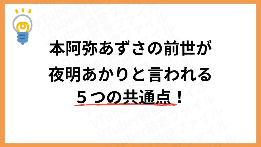 本阿弥あずさと夜明あかりが同一人物だという噂の発端となった、声質・尊敬する人物・好きな作品など5つの共通点は、この前世説の信憑性をさらに高めていると言えるでしょう。
