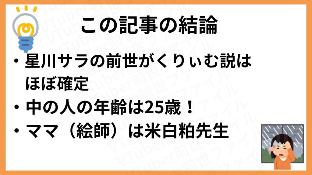 この記事では、星川サラの前世(中の人)、顔バレや年齢について、さまざまな情報を整理しながらわかりやすく解説します!