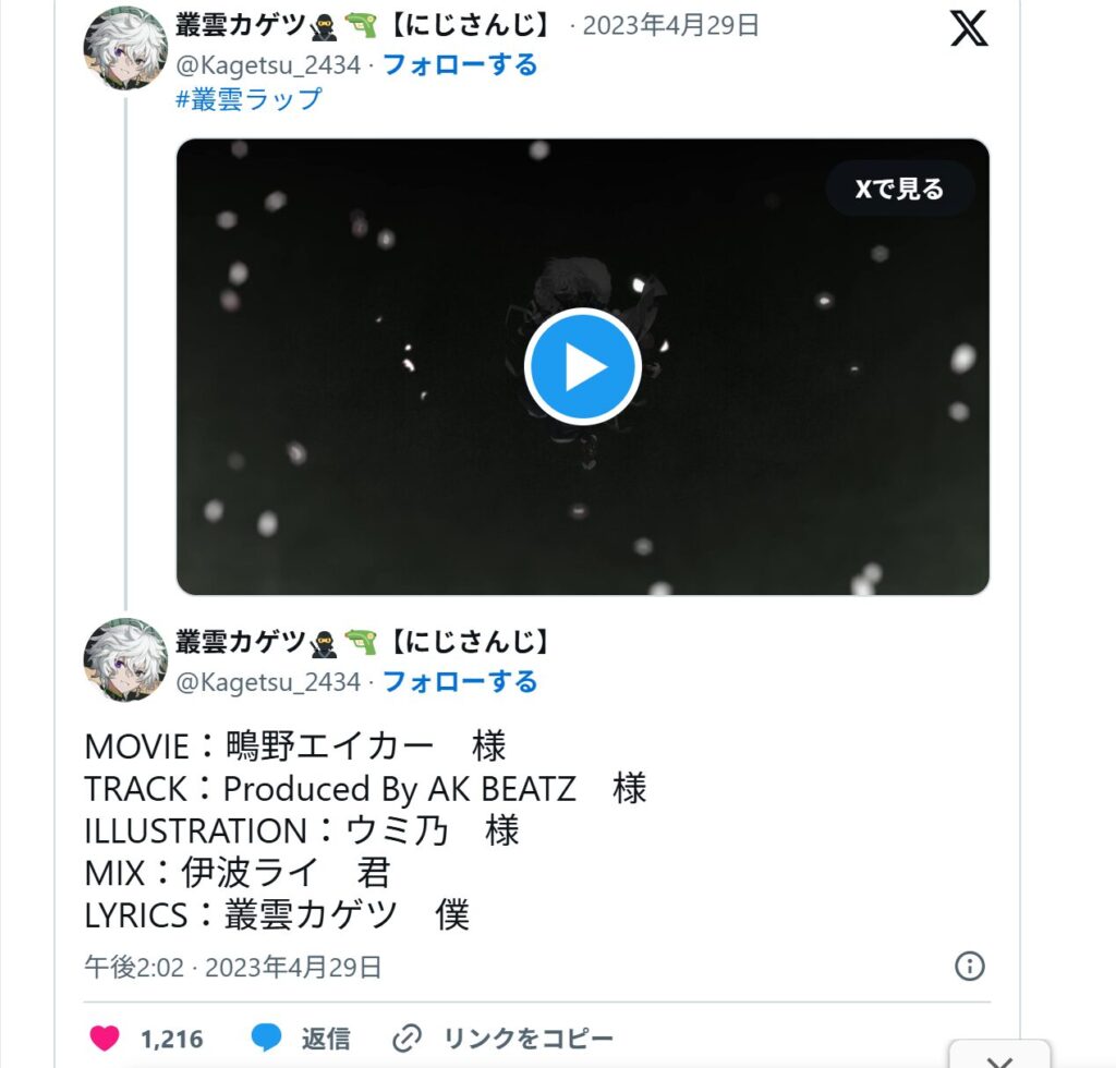 伊波ライは、同期の「叢雲カゲツ」さんの曲のMIXを担当しています↓