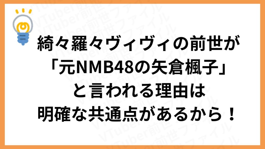こうした5つの共通点から、ファンの間では綺々羅々ヴィヴィの前世は元NMB48の矢倉楓子だと、確信に近い声が上がっています。