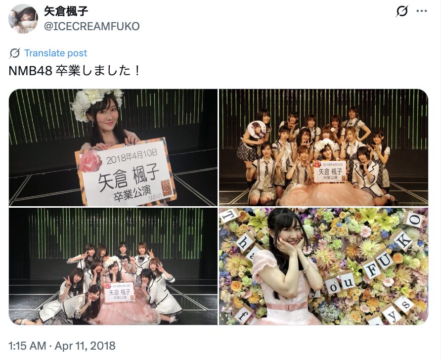 矢倉楓子は2018年4月に卒業コンサートを開催し、同年5月でNMB48を卒業し、その後は女優やタレントとして活動していました。