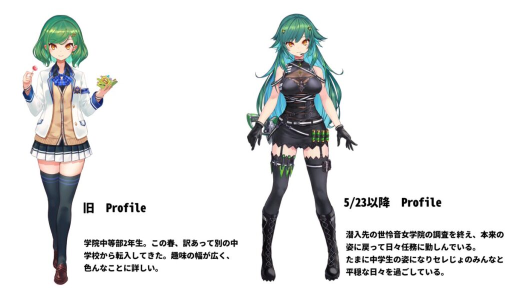 キャラ設定を紹介すると、任務のため14歳の女の子に変身し世怜音女学院へ潜入していました。