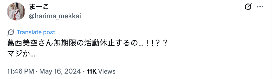 そんな葛西美空ですが、2024年5月16日、自身のSNSで、6月30日をもって無期限活動停止することを発表しました。