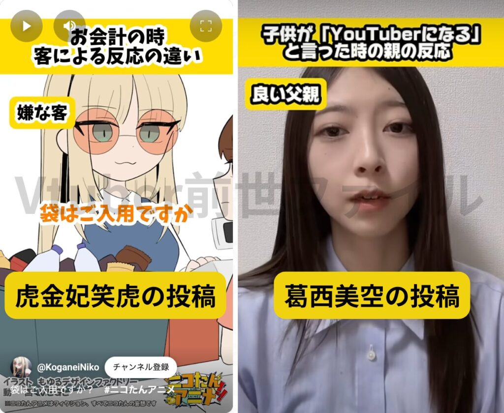 また、虎金妃笑虎と葛西美空はどちらもショートコントのようなお笑い動画を載せています。