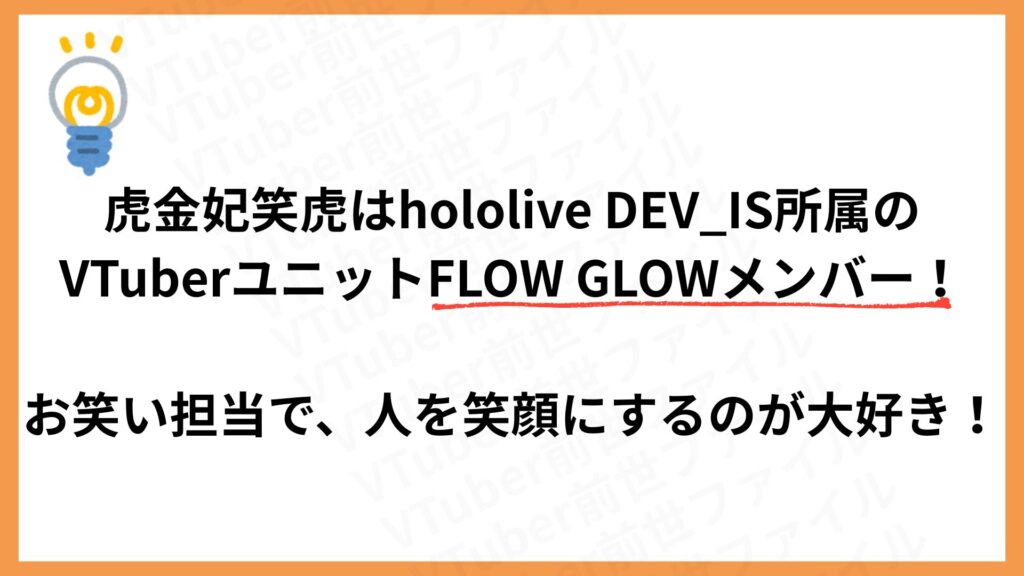 虎金妃笑虎はホロライブDEV_IS所属「FLOW GLOW」のメンバーで、明るくユーモアあふれるお笑い担当です。
