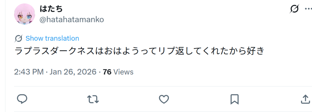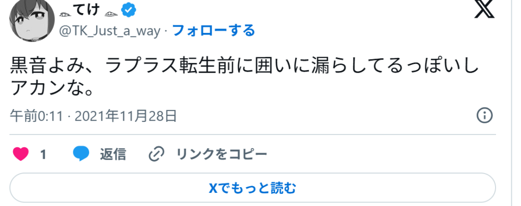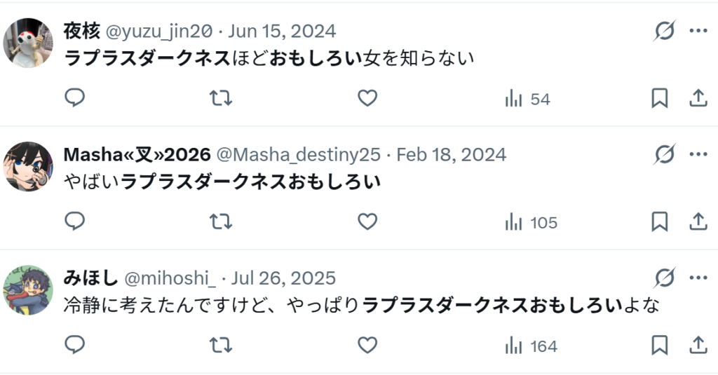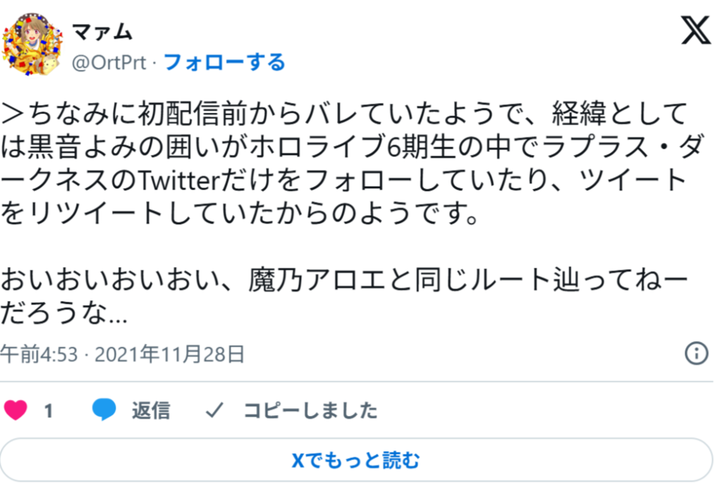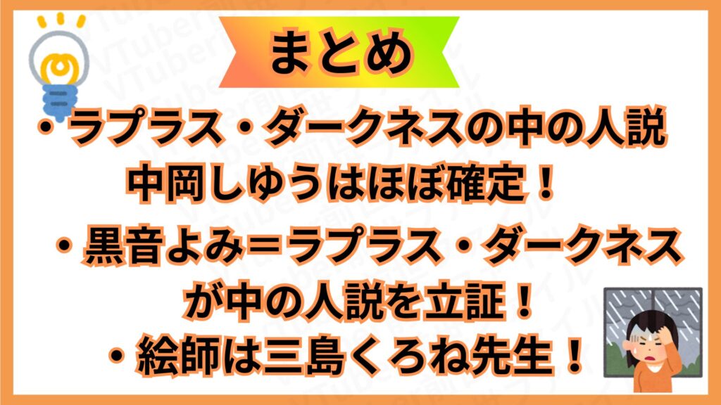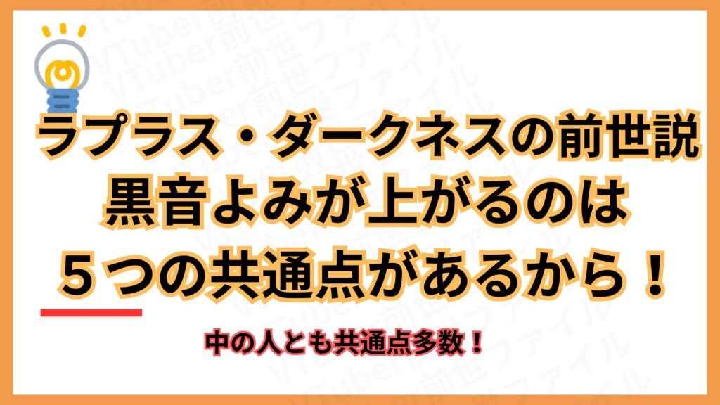 こうした5つの共通点から、ファンの間ではラプラス・ダークネスの前世は黒音よみで、中の人は中岡しゆうだと、確信に近い声が上がっています。