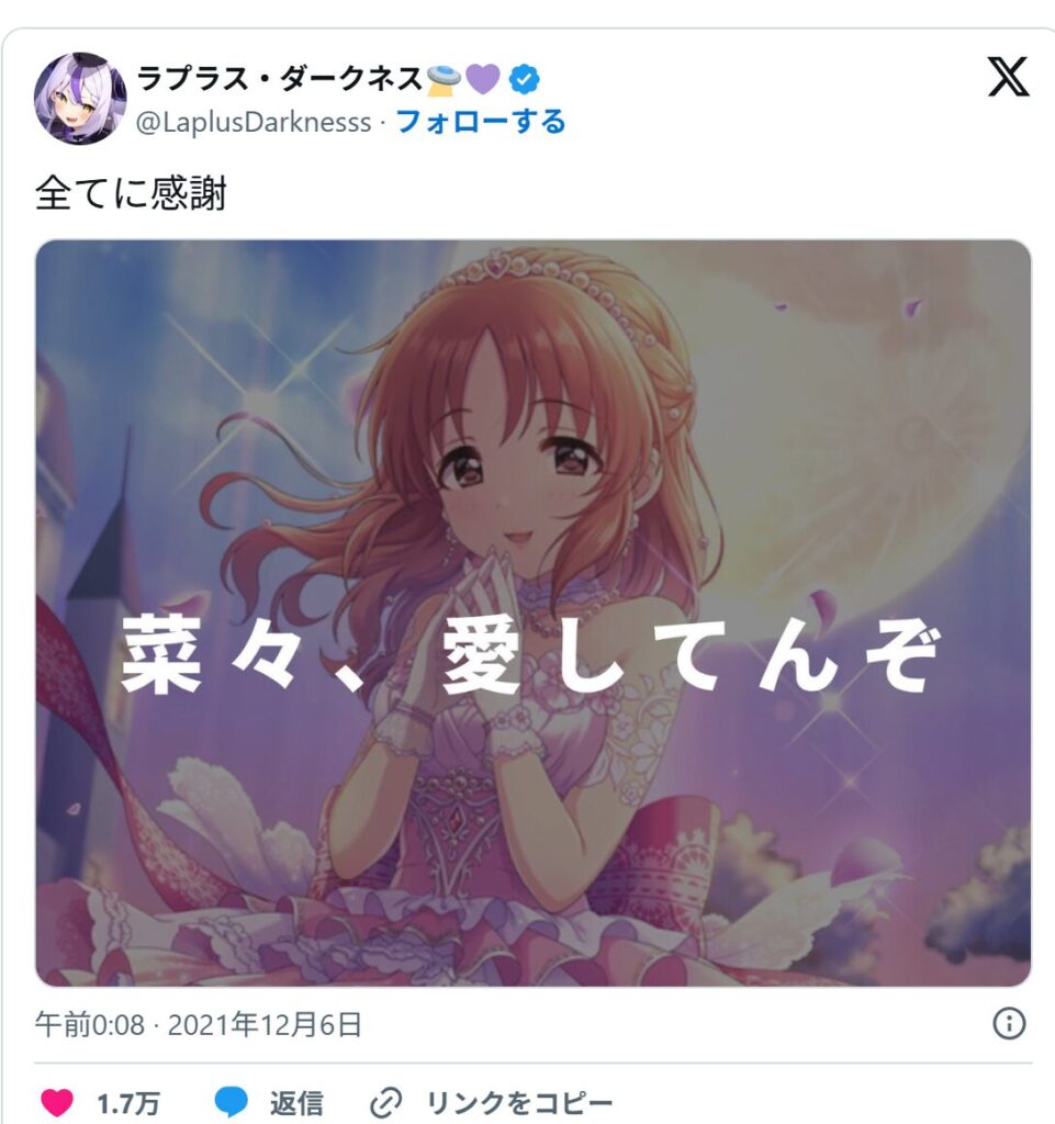 ラプラス・ダークネスは、アイドルマスターのキャラクター「安部菜々」が好きで、「菜々、愛してるぞ」と書かれた画像をツイートしています。