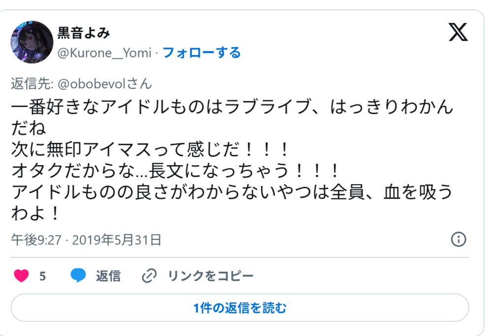 そして黒音よみも、アイドルマスターが好きだとツイートしていました。