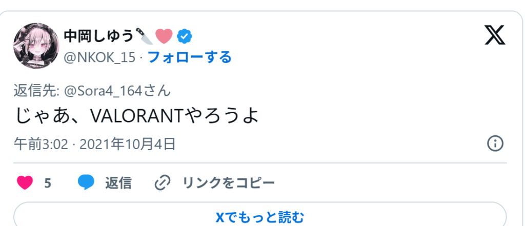 そして中の人と言われている中岡しゆうも、VALORANTをプレイしていることが分かる投稿をXにてしていました。
