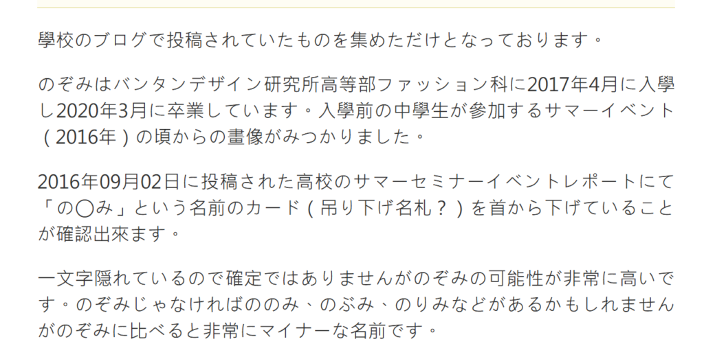 本人は本名を公表していませんが、中の人の学生時代のネームプレートに「のぞみ」と書かれていると指摘する声がありました。