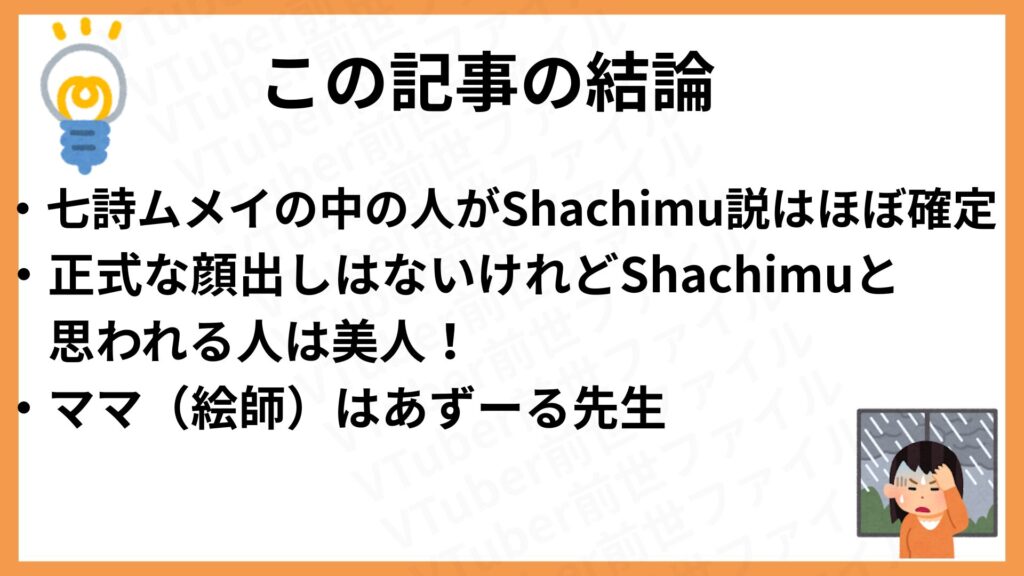 こうした4つの共通点から、ファンの間では七詩ムメイの中の人はShachimuだと、確信に近い声が上がっています。