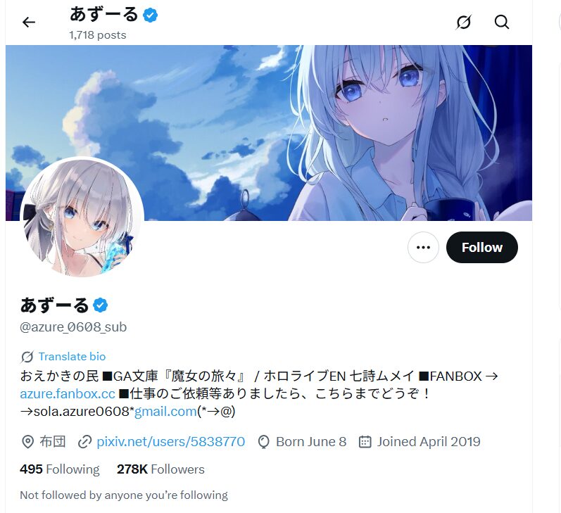 このアカウントでは、イラスト、ファンアートなどが投稿されていたようですが、現在はアカウントが非公開にされ、アクセスできなくなっています。
