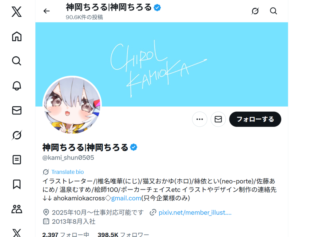 神岡ちろる先生は、VTuber関連のイラスト制作やオリジナルキャラクターのデザイン、VRChat用3Dモデルの制作など、幅広く活動しているイラストレーターです。