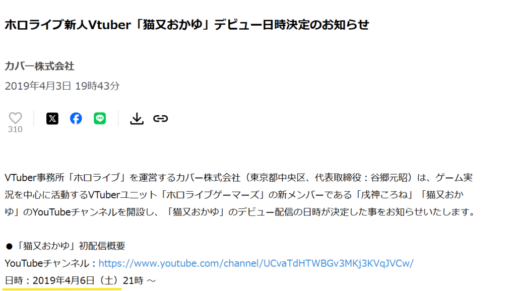 そしてそのすぐ後、2019年4月6日には、猫又おかゆが初配信を行い、新たに活動を始めました。