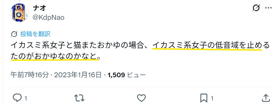 以前、Xでも「イカスミ系女子の声は猫又おかゆより落ち着いていて、少し低め」といったコメントが見られました。