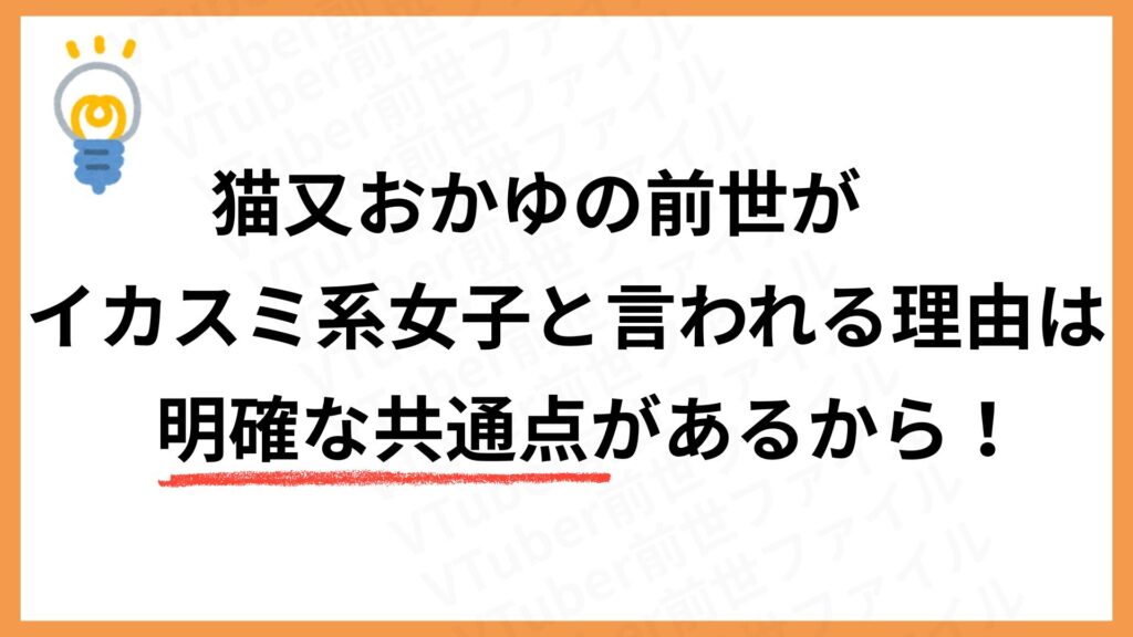 こうした6つの共通点から、ファンの間では猫又おかゆの前世はイカスミ系女子だと、確信に近い声が上がっています。