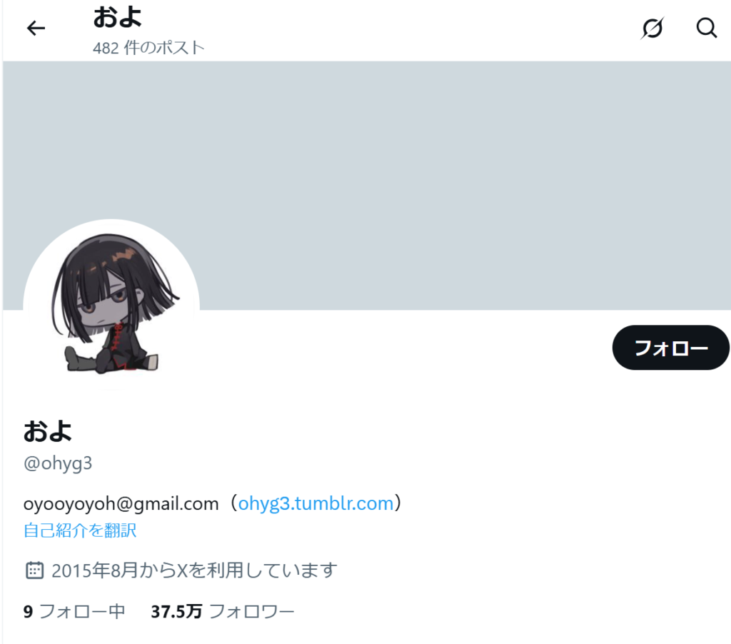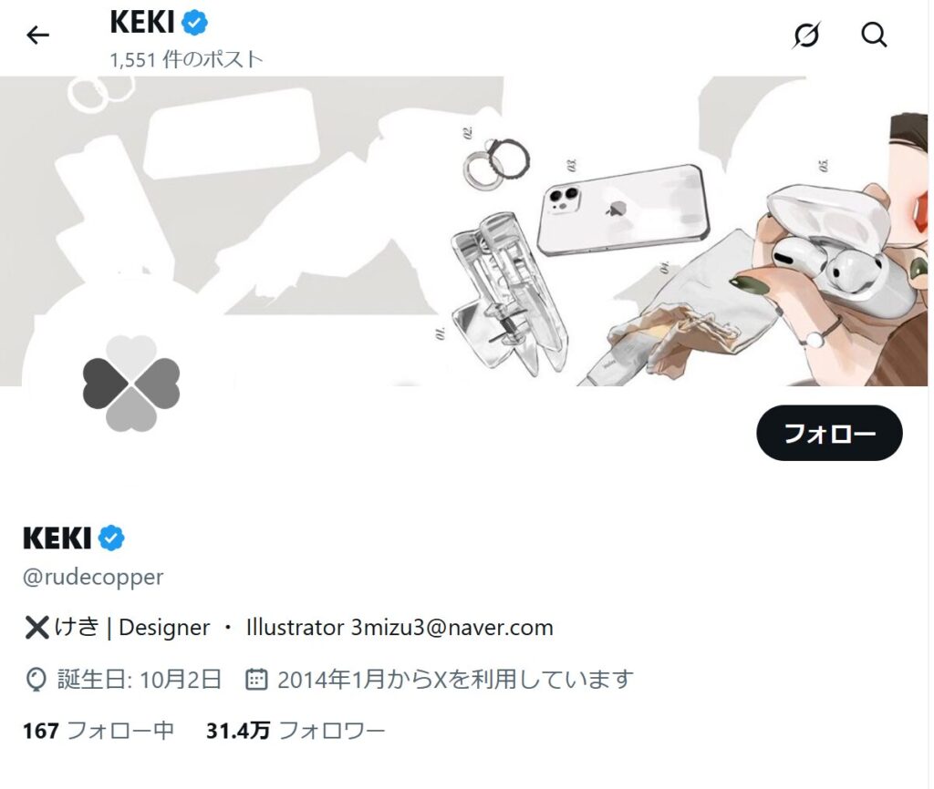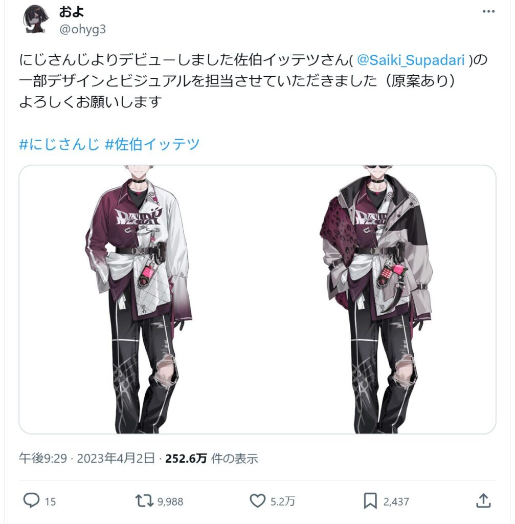 イラストレーターにしてはTwitterのフォロワー数も37.5万人と多く、デビューしたばかりの佐伯イッテツのデザインとビジュアルを担当したと言うツイートには5万を超えるいいねがついています。