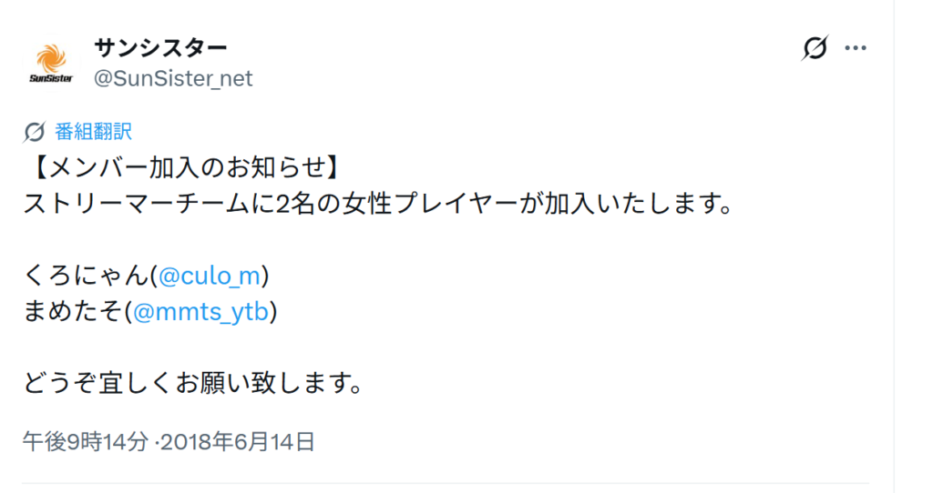 そして2018年にはプロゲーマーチームである「SunSister」に加入していました。