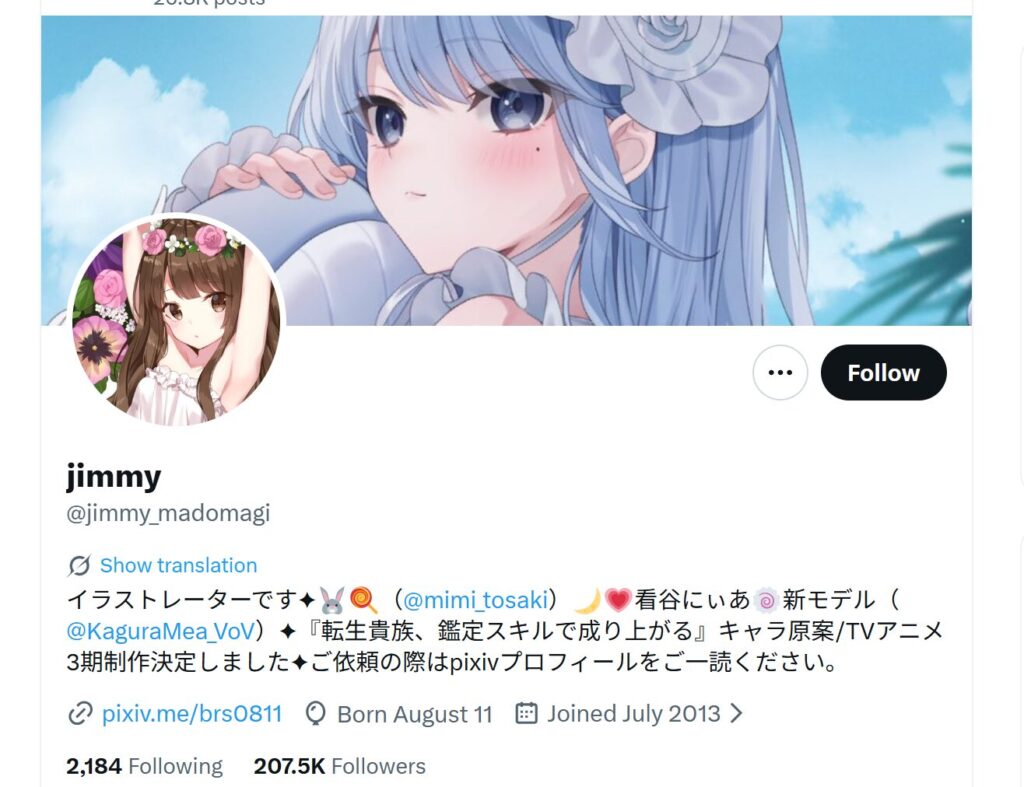 イラストレーターとしてはそこそこ多い20万人を超えるフォロワーがいるので、jimmy先生の作品が好きなファンがたくさんいることが分かります。