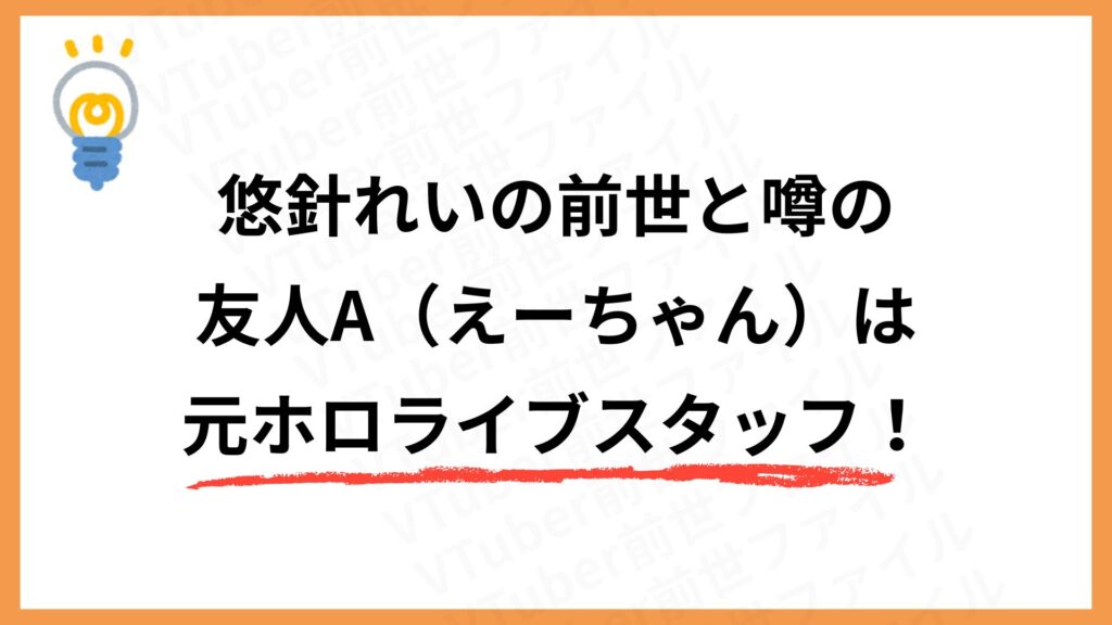 なんと、悠針れいはホロライブプロダクションの元スタッフ友人A(えーちゃん)(ゆうじんえーちゃん)では?と噂になっているようです。